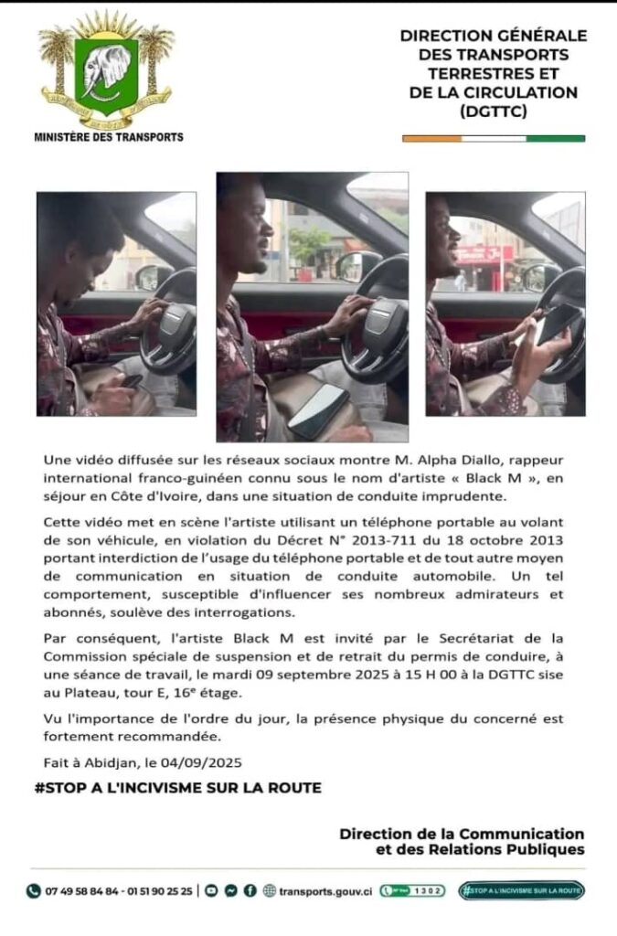 En conséquence, Black M est convoqué le mardi 09 septembre 2025 à 15h00 au siège de la DGTTC, situé au Plateau (Tour E, 16e étage), pour une séance de travail avec la Commission spéciale de suspension et de retrait du permis de conduire.
