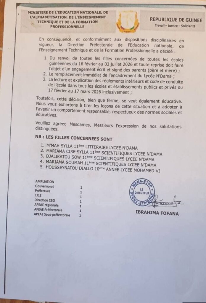 - Exclusion temporaire nationale : cinq élèves sont interdites de fréquentation dans tous les établissements scolaires du pays du 16 février au 3 juillet 2026.