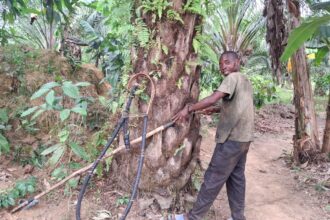 Gbèlèye–N’Zérékoré : suspendu entre ciel et danger, le combat quotidien d’un jeune cueilleur de noix de palme.