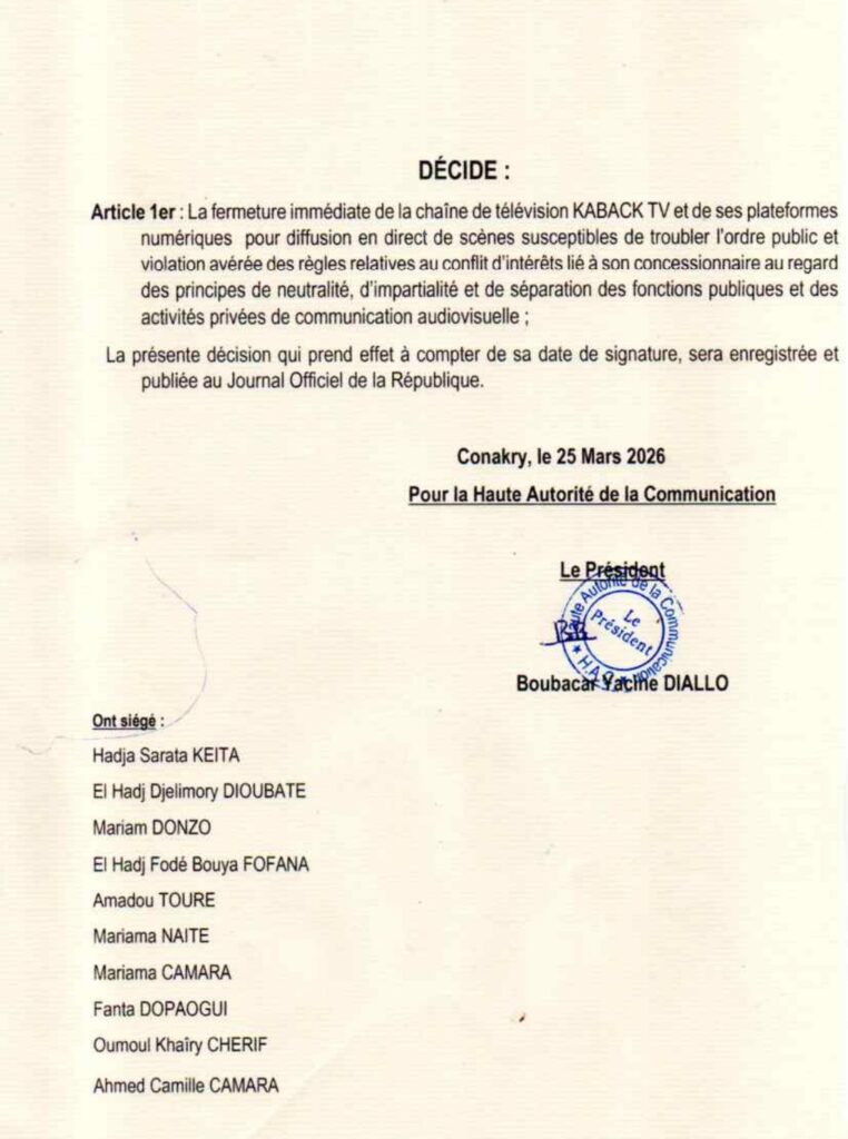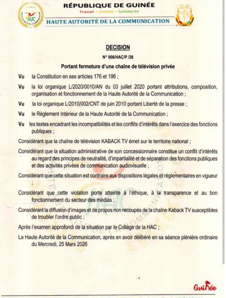 La Haute Autorité de la Communication (HAC) a décidé, ce mercredi 25 mars 2026, de fermer immédiatement la chaîne de télévision privée Kaback TV ainsi que ses plateformes numériques.