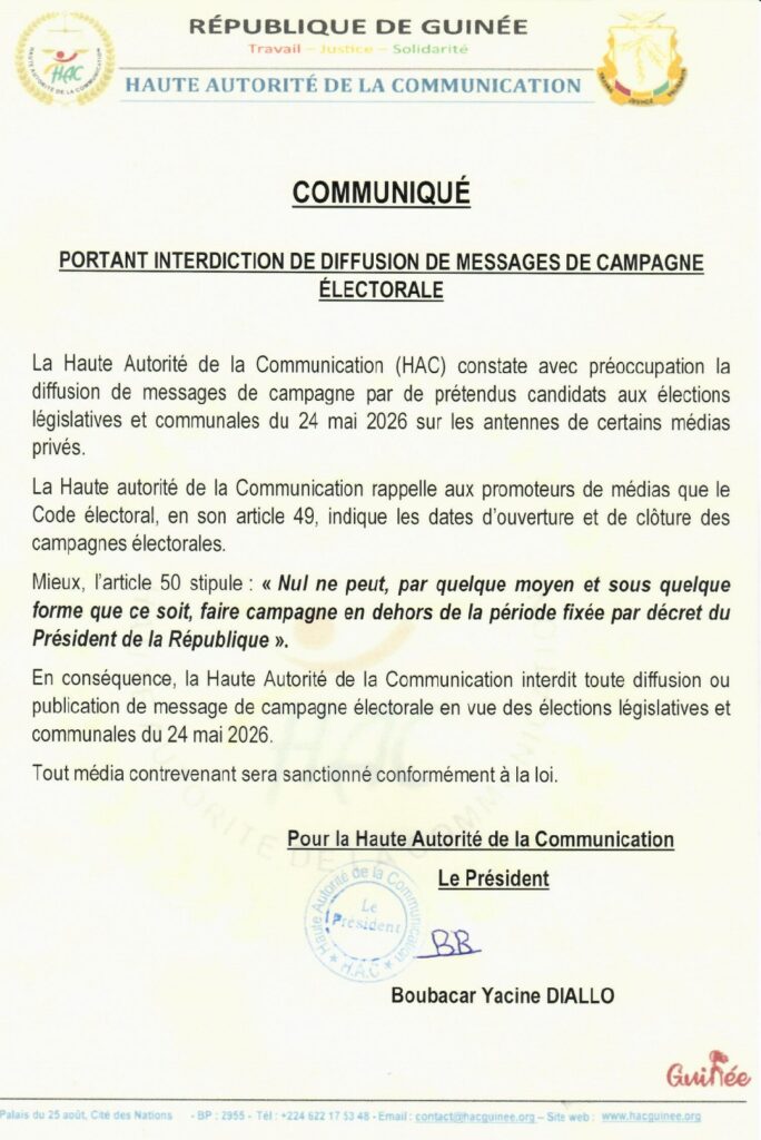 La Haute Autorité de la Communication (HAC) hausse le ton. Dans un communiqué officiel, l’organe de régulation des médias en République de Guinée annonce l’interdiction formelle de toute diffusion de messages de campagne électorale en dehors de la période légalement fixée, en vue des élections législatives et communales prévues le 24 mai 2026.