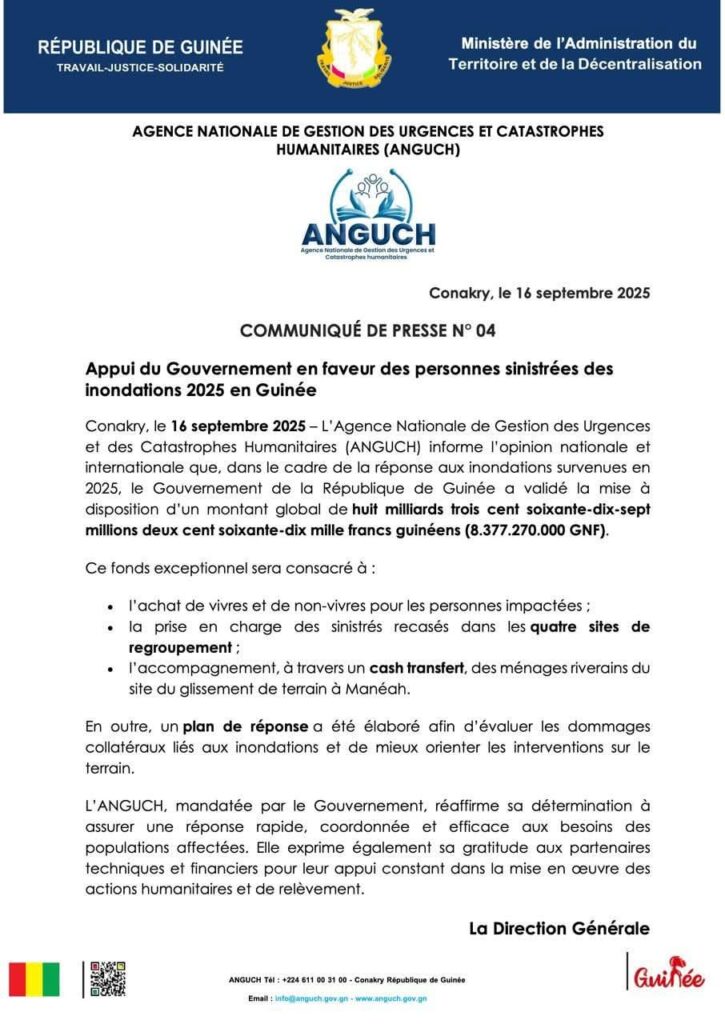 Dans un communiqué diffusé sur sa page Facebook ce mercredi, 17 septembre 2025, l’agence nationale de gestion des urgences et catastrophes humanitaires (ANGUCH) a annoncé l’appui du gouvernement guinéen à hauteur de 8 milliards GNF pour assister les sinistrés d’inondation en 2025.