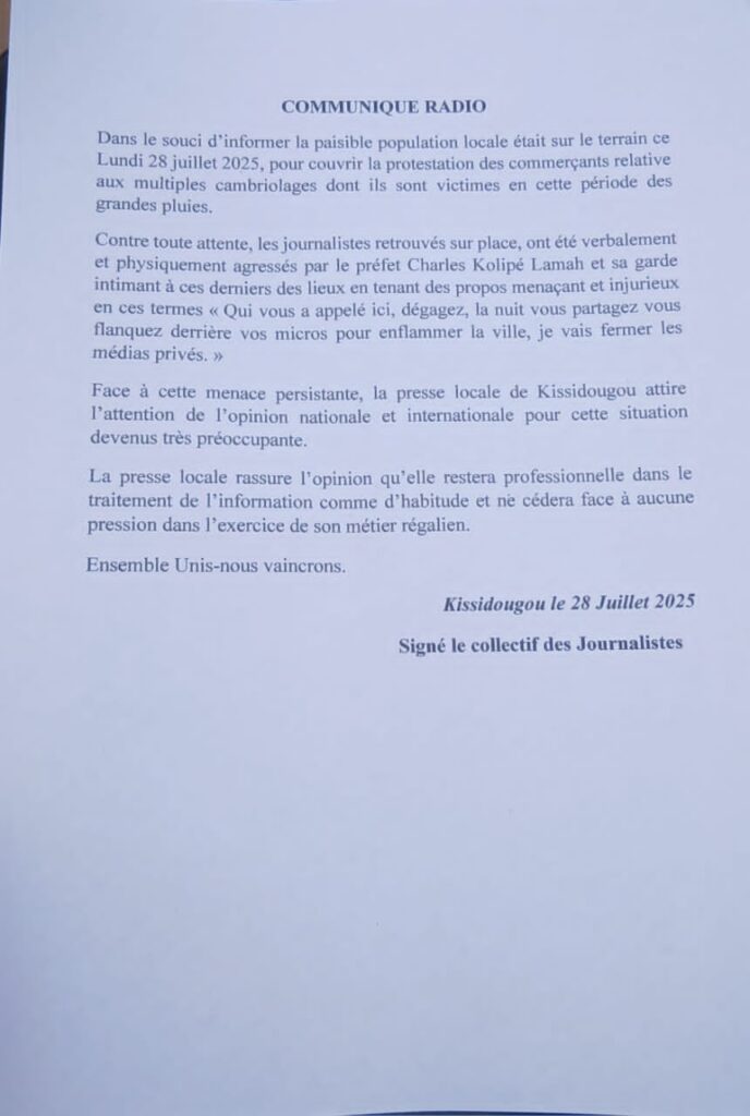 Un climat de tension et d’indignation secoue actuellement la ville de Kissidougou, après un incident jugé grave entre le préfet Colonel Charles Kolipé Lamah et plusieurs journalistes venus couvrir une manifestation de commerçants. Les faits se sont déroulés ce lundi 28 juillet 2025, en plein centre-ville, au siège de la chambre préfectorale de commerce.