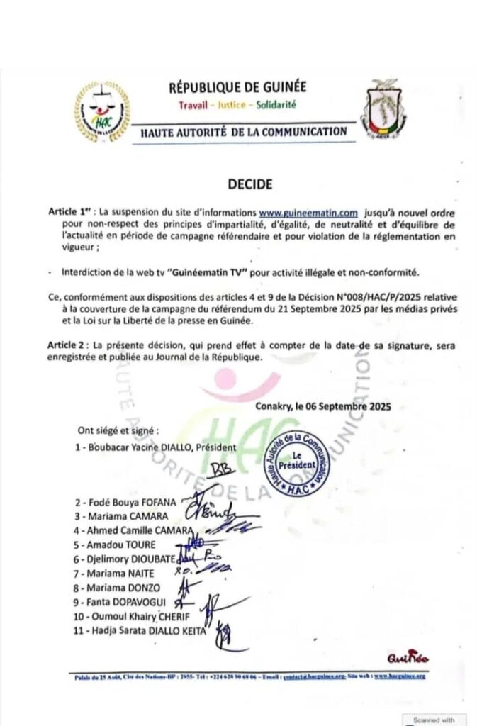 Dans une décision rendue publique ce samedi, 06 septembre 2025, la Haute autorité de la communication (HAC) a suspendu le site d’information www.guineematin.com pour dit-on « Non-respect de principe d’impartialité, d’égalité, de neutralité… »