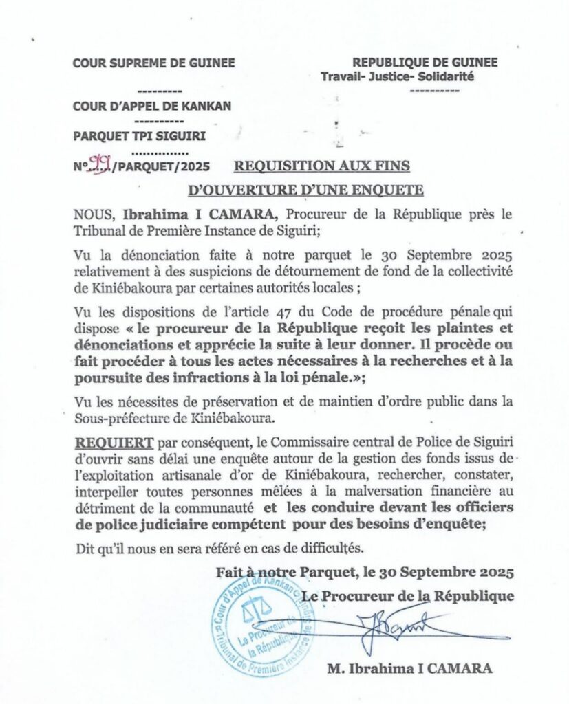 Dans une réquisition officielle datée du 30 septembre 2025, le Procureur de la République près le Tribunal de Première Instance de Siguiri, M. Ibrahima I. Camara, a ordonné l’ouverture immédiate d’une enquête portant sur la gestion des fonds issus de l’exploitation artisanale d’or dans la collectivité de Kiniébakoura.