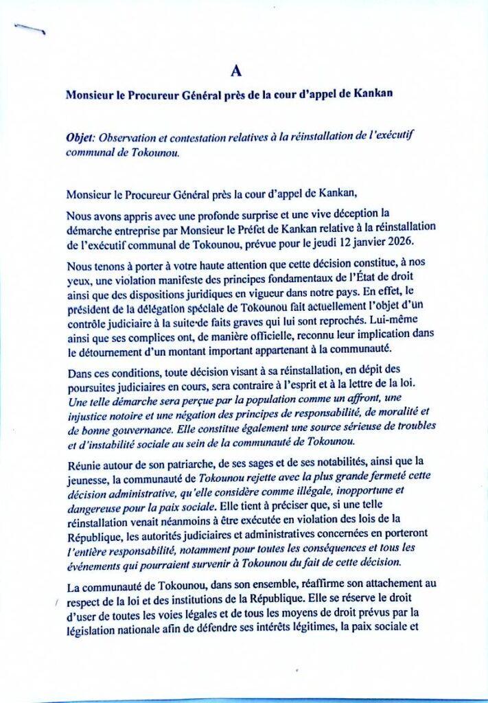 Une vive tension s’était installée à Tokounou à l’annonce de la réinstallation de l’exécutif communal, initialement prévue le jeudi 12 janvier 2026. Dans une correspondance adressée au Procureur Général près la Cour d’appel de Kankan, la communauté locale avait exprimé son opposition ferme à cette décision administrative.